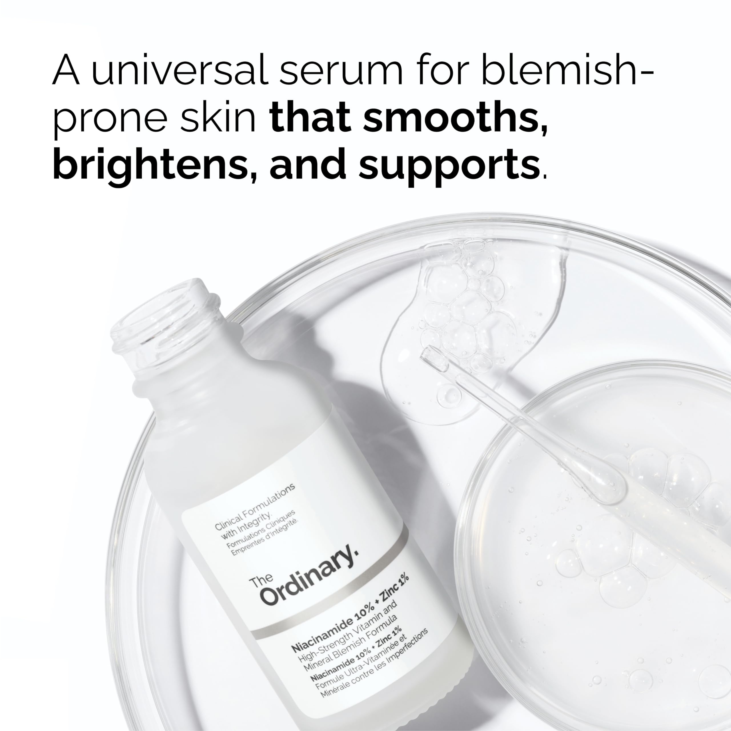 - NIACINAMIDE 10% + ZINC 1% 1 FL OZ: is a water-based serum that boosts skin brightness, improves skin smoothness and reinforces the skin barrier over time. It contains a high 10% concentration of Niacinamide (vitamin b3) and zinc PCA.